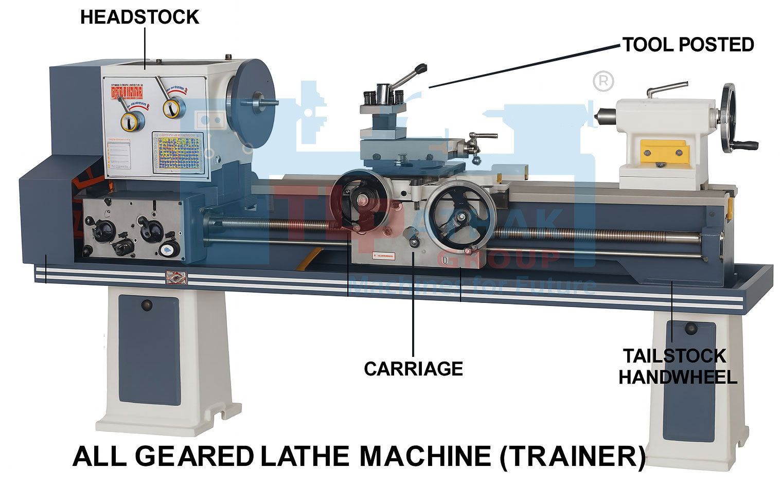 3D angled front view with all parts labeled for All Geared Lathe Machine Trainer
