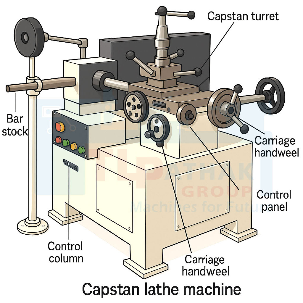 3D angled front view with all parts labeled for Capstan Lathe Machine