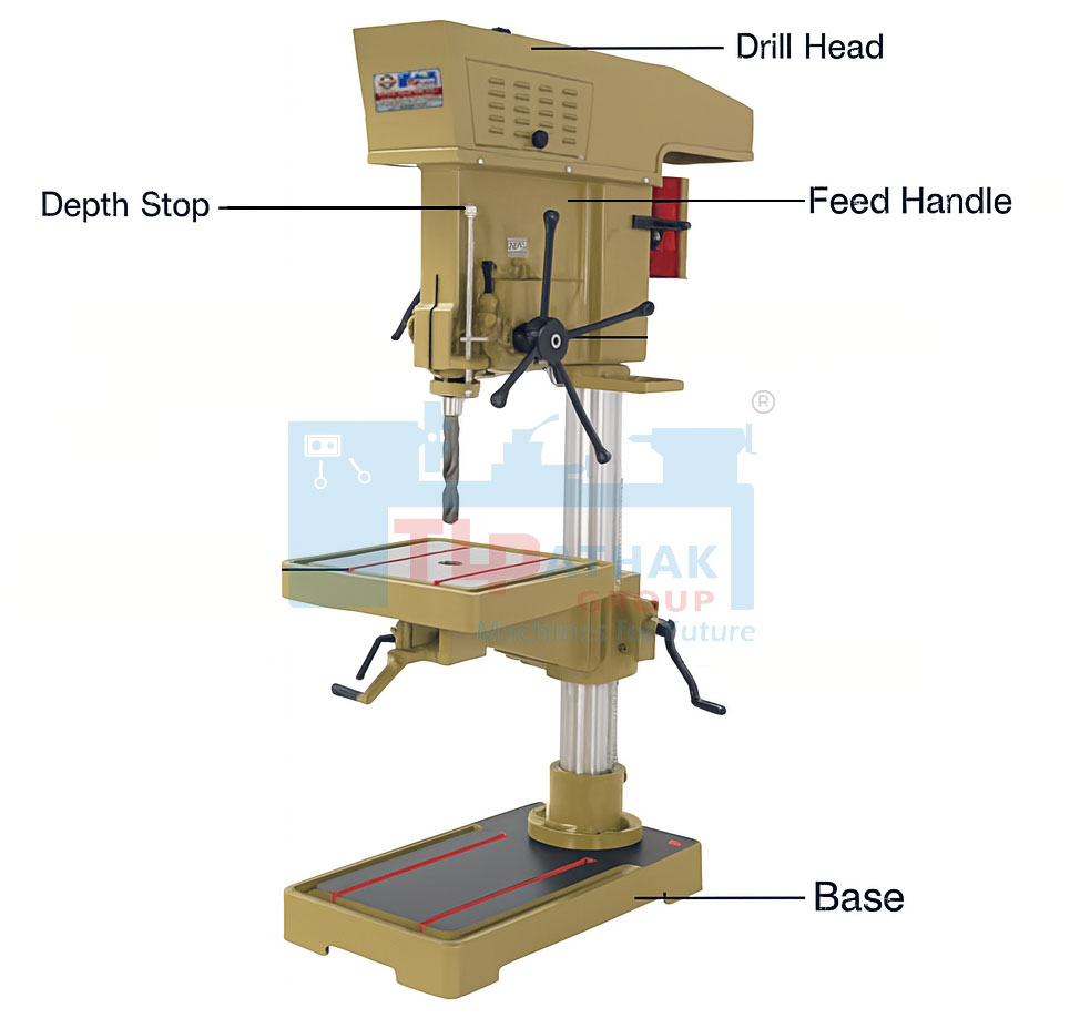 | Column (Pillar) | Vertical post that supports the drill head and table |